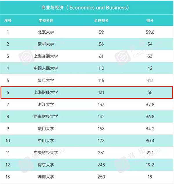USNews2021年世界大学学科排名数据显示,本届排名包含38个学科,来自中国内地200所不同高校的1488个学科入围榜单。除了54个世界前10学科外,内地高校有262个学科进入世界前50,474个学科进入世界前100位。内地高校中,许多高校整体学术水平已迈向世界第一梯队。商业与经济学科共有13所高校上榜,上海财经大学排名第6。榜单如下: