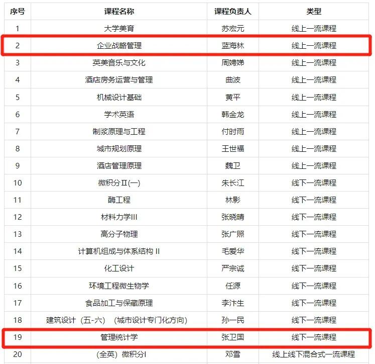 华南理工大学工商管理学院张卫国院长的《管理统计学》课程入选为国家级一流线下本科课程、蓝海林教授的《企业战略管理》课程入选为国家级一流线上本科课程。