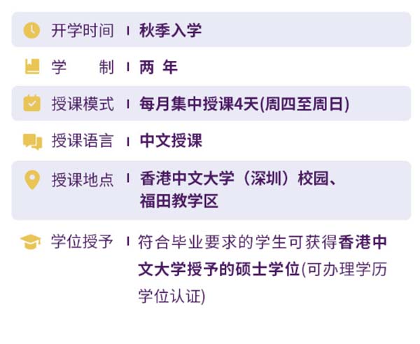 2021级金融EMBA项目采用国际通行申请制度,学校自主组织入学考核。本课程学制两年、中文授课,符合毕业要求的学生可获得香港中文大学授予的硕士学位,可在教育部留学服务中心办理学历学位认证。