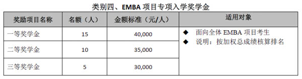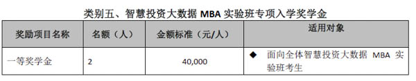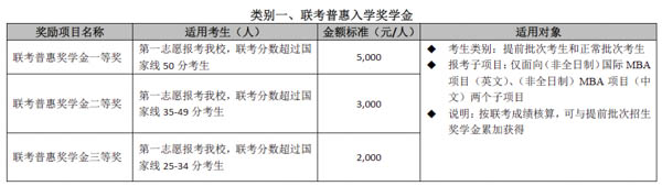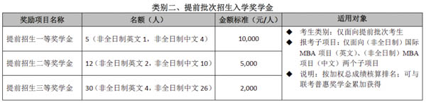 设立五种类别入学奖学金,以资鼓励报考贸大MBA/EMBA项目、全国联考初试分数成绩优秀、提前批次招生面试表现出色的考生。
