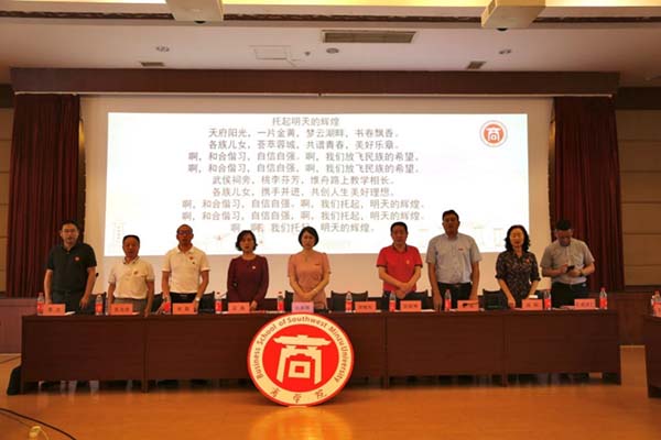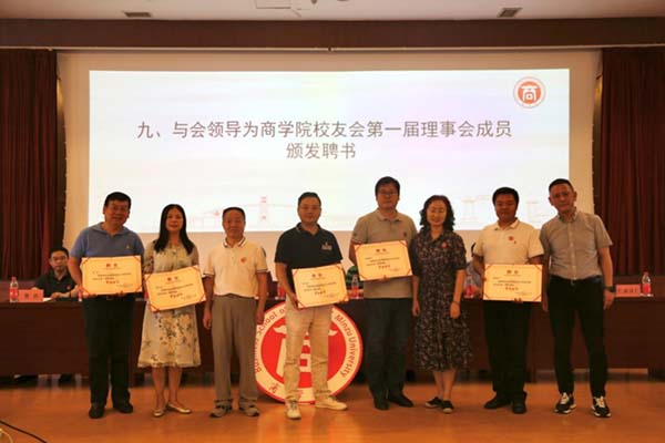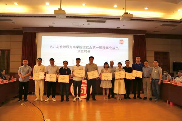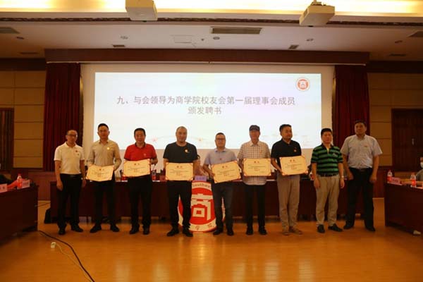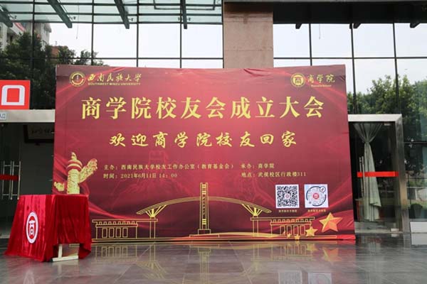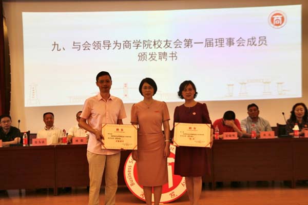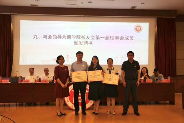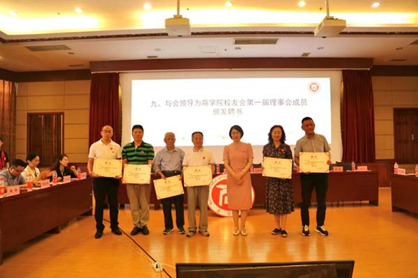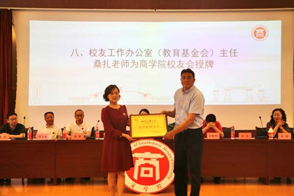 商学院党委书记龚浩作《商学院校友会筹备工作报告》、《第一届理事会候选人产生情况报告》,院长袁蕴宣读《西南民族大学商学院校友会章程(草案)》,审议并通过《西南民族大学商学院校友会章程》。大会选举产生了商学院校友会第一届理事会成员。首届校友会组织机构的诞生,掀开了商学院校友工作的新篇章。校友工作办公室(教育基金会)主任桑扎为商学院校友会授牌,与会领导为商学院校友会第一届理事会成员(顾问、会长、法律顾问、副会长、常务理事、理事、秘书长、常务副秘书长等)颁发了聘书。