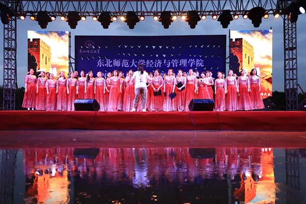 经济与管理学院教师合唱团为毕业生带来合唱《万疆》,正当演唱之时,突降大雨,经管教师在雨中完成了演出,场面震撼,令人动容。经管教师的嘹亮歌声在雨夜的钟楼下回荡,毕业生们在台下合唱,感动的泪水与雨水交织,再多的言语也无法诉说此刻的心情。