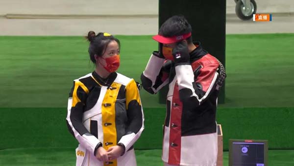 接着美国队连续两枪压制中国组合,下一枪杨皓然打出10.8环,杨倩打出10.6环,中国队连续拿分追到9平。下一枪美国队险胜拿下2分,但紧接着中国队打出了21.3的高分,再次打平。