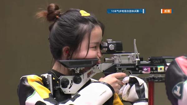 第二阶段,8对选手成绩清零重新出发。第一组的10枪,杨皓然的状态非常恐怖,没有一枪下10.3环,打出了106.2环,杨倩状态稍显一般,打出103.3环,累积209.5环,暂列第二。最后的10枪,杨皓然稳定输出打出105.5环,杨倩的状态也有了起色,打出104.7环,两组过后总成绩419.7环,排名预赛第一杀进最后的决赛,与排名第二的美国争夺金牌。