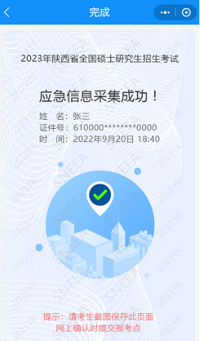 4.“应急信息采集成功”界面。请考生于10月28日至11月4日扫描二维码进入“陕西考试招生”小程序,进入小程序后请考生使用研究生考试报名时填写的证件号码及姓名验证通过后填报相关信息。