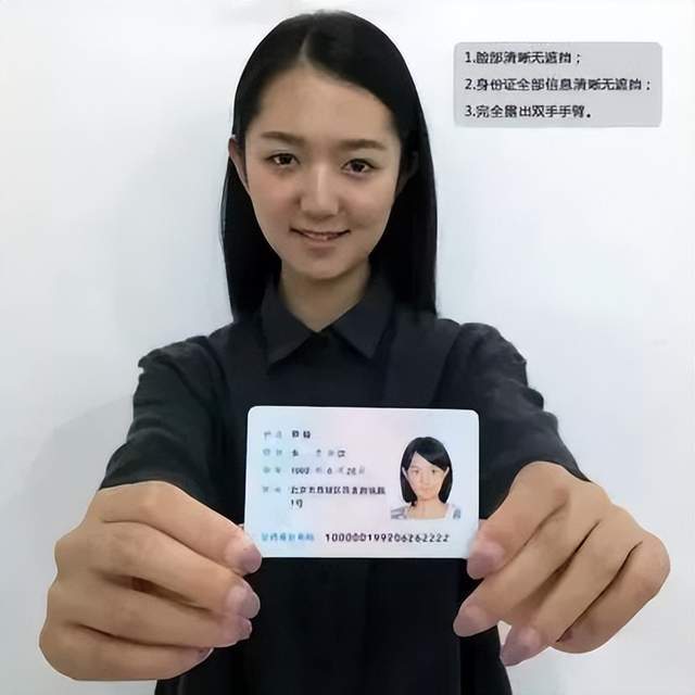 拍摄时,必须将本人持证的手臂和上半身整个拍进照片,头部和肩部要端正,头发不得遮挡脸部或造成阴影,要露出五官;确保身份证上的所有信息可见、完整。