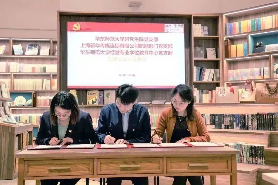 为更好地学习和贯彻二十大会议精神,强化党建引领业务的功能,推进党建工作与人才培养深度融合,全面落实产教融合战略部署,11月11日上午,华东师范大学研究生院党支部、华东师范大学经管专业学位教育中心党支部、上海新华传媒连锁有限公司职能部门党支部开展联合党建活动,签订三方党支部共建协议和研究生实践基地协议,通过校企联动、同上党课,深入推进校企协同发展。