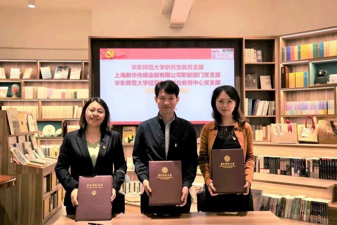 随后,三个党支部进行了党建共建协议签约,华东师范大学经管学部与上海新华传媒连锁有限公司进行了校企实践基地签约和授牌。