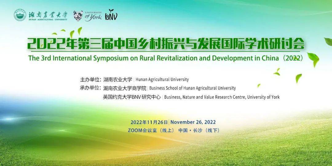 2022年第三届中国乡村振兴与发展国际学术研讨会于2022年11月26日在湖南农业大学召开,会议由湖南农业大学商学院和英国约克大学BNV研究中心承办,主会场设湖南农业大学第十教学楼北102会议室。 全面推进乡村振兴,要坚持农业农村优先发展,坚持城乡融合发展,畅通城乡要素流动。新时代新征程上,如何夯实好国家粮食安全根基,如何深入实施种业振兴行动,如何强化农业科技和装备支撑,实现乡村振兴,是一个跨学科的系统性课题。为此,本会议基于社会科学的多学科视角(社会学、经济学、地理学、管理学、土地管理、空间经济学和公共治理等),以习近平新时代中国特色社会主义思想为指引,以服务国家“三农”发展重大战略为导向,全面理解乡村振兴的内涵、外延及实施路径和机制,推动相关学科交叉与融合发展。