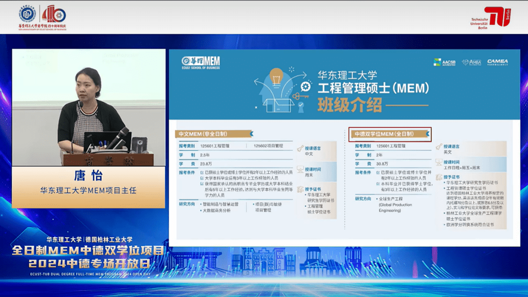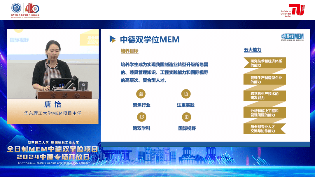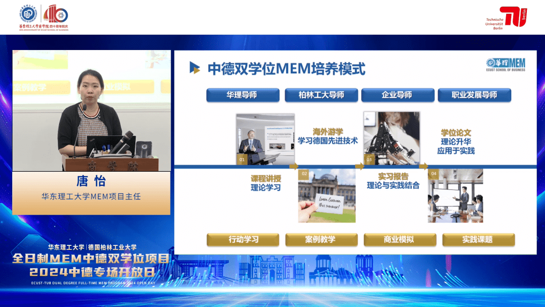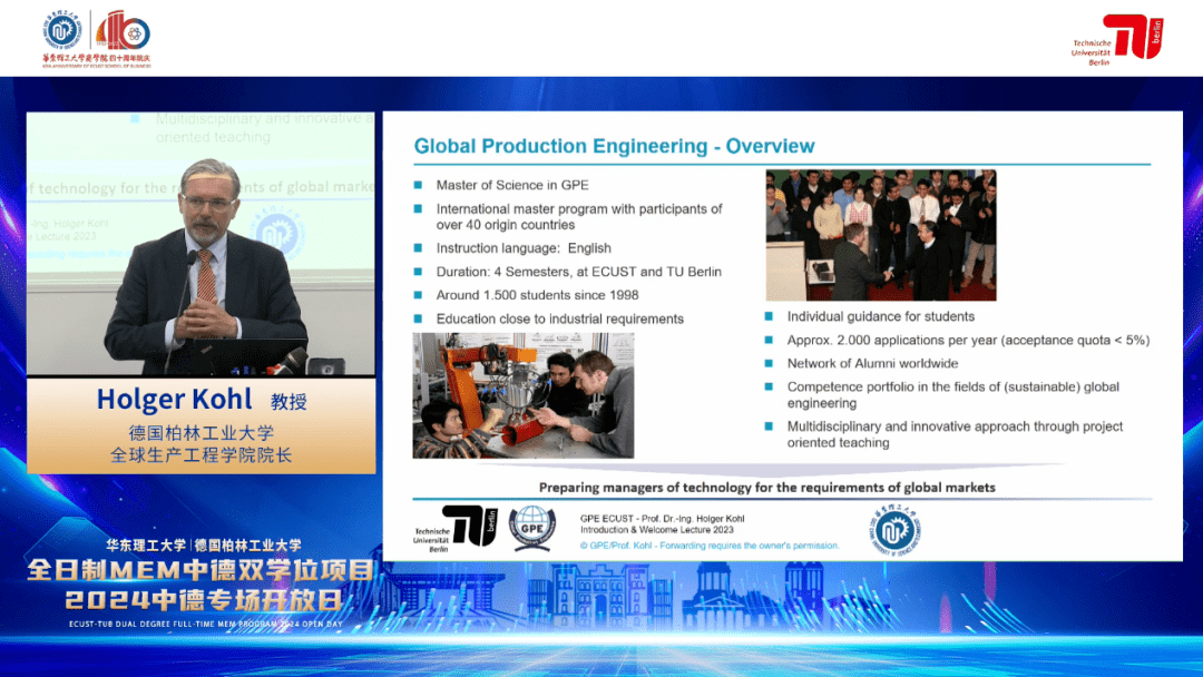 发布会伊始,董双老师对中德双学位MEM项目以及德国柏林工业大学全球生产工程学院院长Holger Kohl 进行了简要介绍。她提到,融合德国柏林工业大学全球生产工程硕士与华东理工大学工程管理硕士优势课程开设的双学位工程管理硕士项目,拥有融贯中西学术造诣深厚、教学经验丰富的师资团队,课程体系兼具特色化、创新性、精细化与专业化,能有效培养学生将专业理论知识应用于解决实际问题的能力以及创新创业的能力。