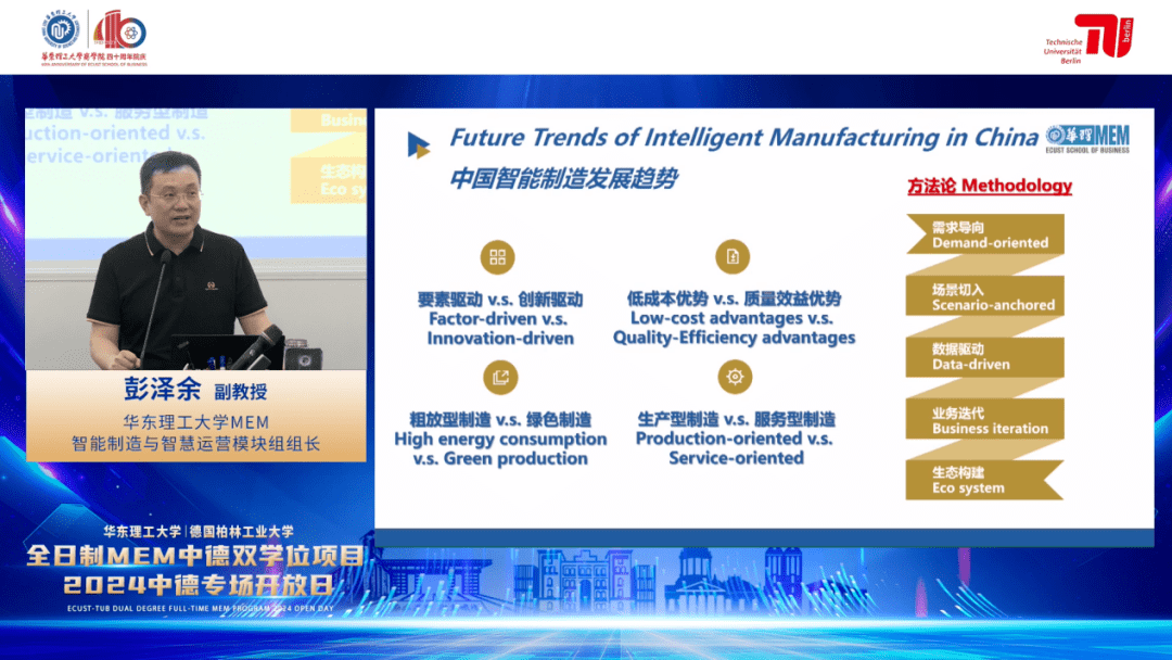德国柏林工业大学全球生产工程学院院长、教授Holger Kohl,华东理工大学商学院副教授、华理MEM智能制造与智慧运营课程模块组长彭泽余,中德双学位MEM校友、宝尔捷自动化设备(上海)有限公司项目经理王骏杰,华东理工大学MEM项目主任唐怡齐聚现场,分享数字化转型与制造业发展行业新知,畅谈就读体验与成长收获,解读项目详情与最新招生政策,带领考生全方位洞悉华理全日制MEM中德双学位项目魅力。活动由华东理工大学MEM授课教师董双主持。