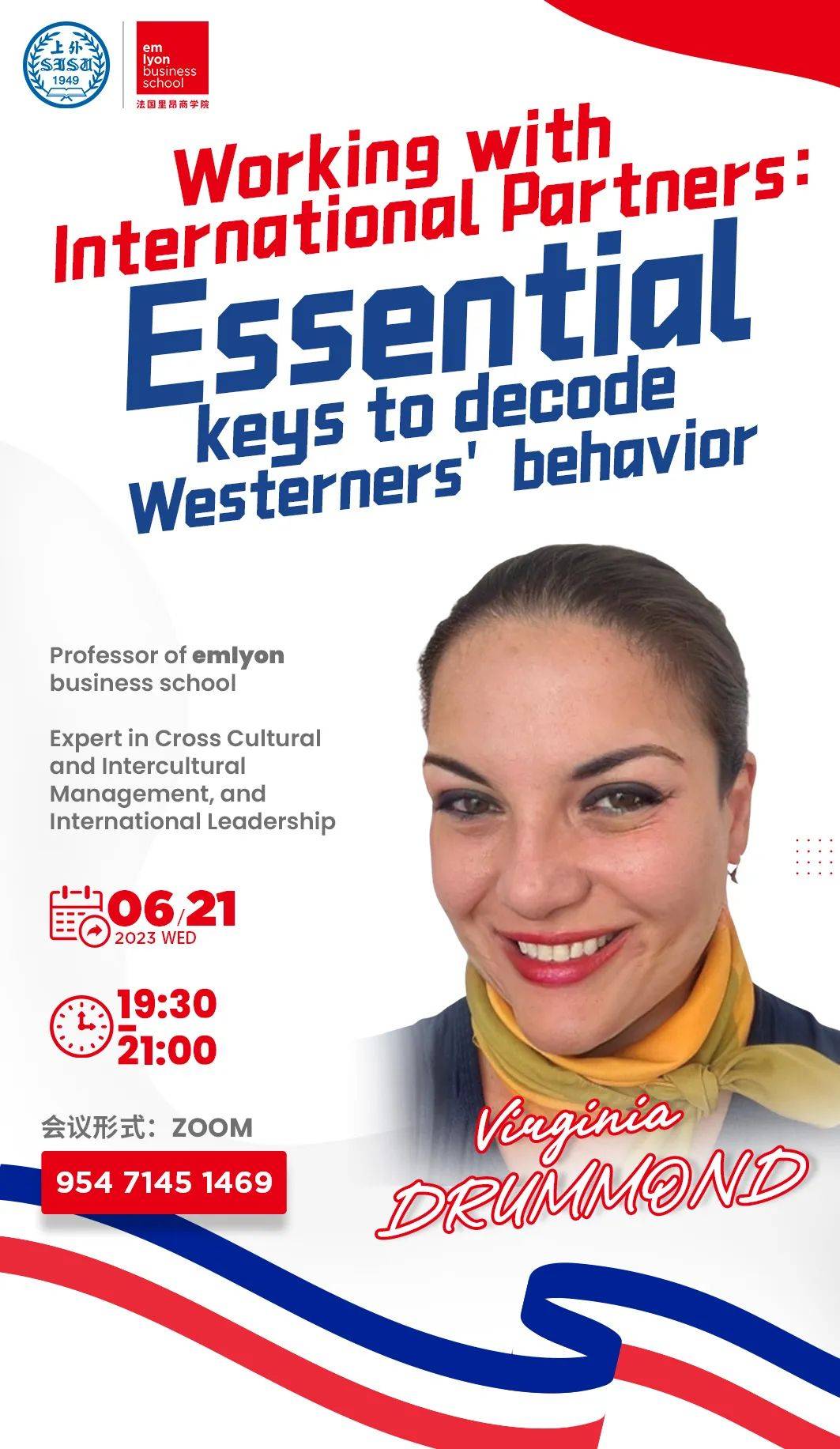 法国里昂商学院教授、跨文化管理及国际领导力专家Virginia Drummond带来主题为《国际合作:破译西方人行为密码》的线上讲座,详细探讨了国际商务与跨文化交流的特点、策略和注意事项,为学员们拓展视野和认知、提升国际交流能力、有效开展跨文化商业活动奠定了良好基础。