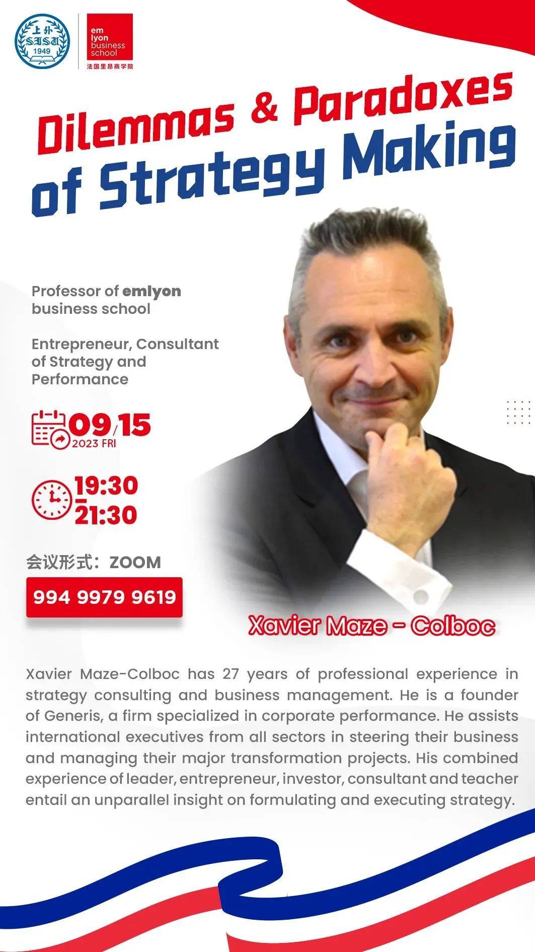 法国里昂商学院教授、战略咨询和企业管理专家Xavier Maze进行了主题为《战略制定的困境与悖论》的线上分享。Xavier Maze从战略开发、战略落地和战略监控管理等方面出发,建议企业应加强对竞争环境的认知和自身能力的评估,并列举了多种具体措施帮助管理者应对战略悖论,为企业实现可持续发展指明方向。