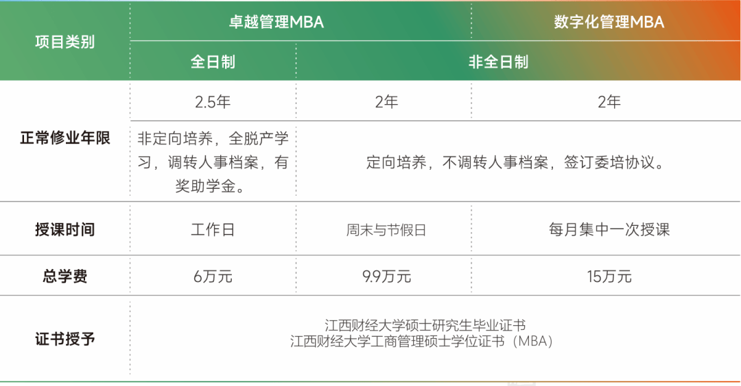 江西财经大学MBA教育依托学校的学科、专业和智力优势,服务区域经济社会发展,凸显创新创业、东方管理和数字化特色,经过多年的发展,已形成“江西是标杆,中部有地位,全国有影响”的良好品牌效应,目前拥有卓越管理MBA、数字化管理MBA、 中美合作培养MBA以及非学历培训等项目,为国家社会经济发展培养高级经济管理类人才近三万人,大多已成为 所在领域管理层的中坚力量。