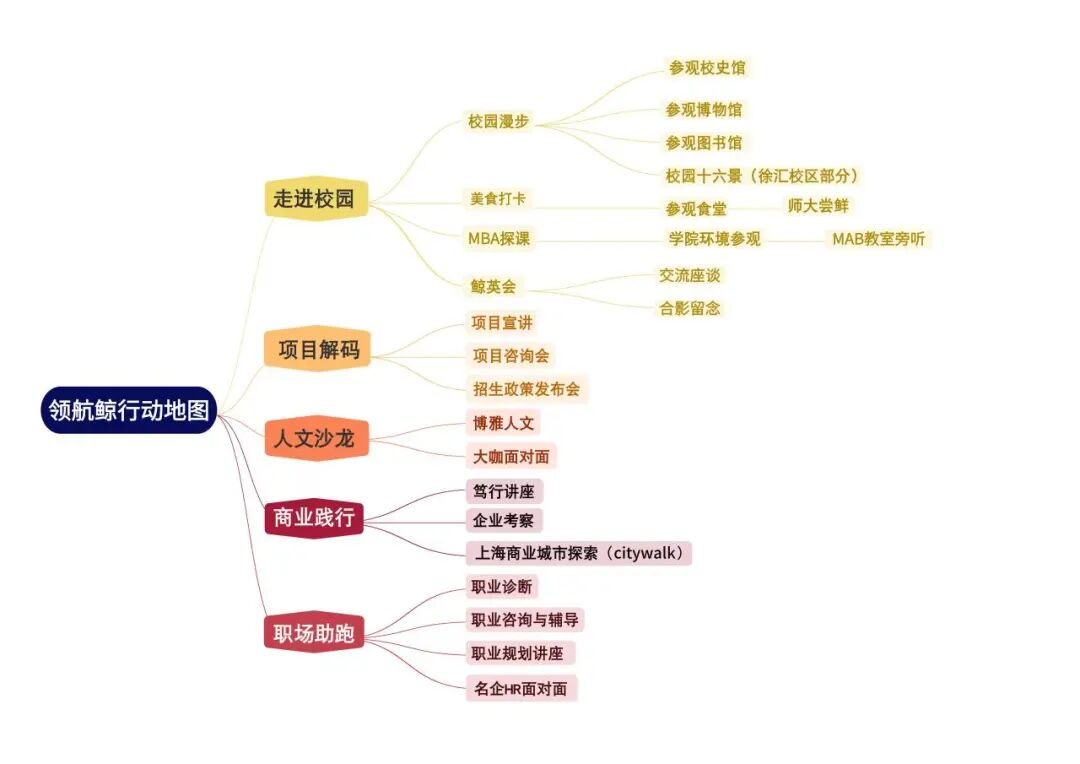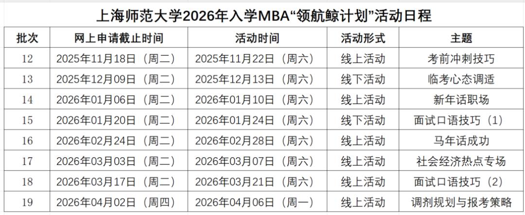 上海师范大学2026年入学MBA“领航鲸计划”是上海师范大学MBA项目为关注和有意向报考上海师范大学MBA项目的考生设立的专属活动,包括走进校园、项目解码、人文沙龙、商业践行、职场助跑等五大板块十六个方面的内容。2025年5月启动,线下线下形式兼顾,主题多样化,并结合“鲸群社群”互助机制从备考到入学全程陪伴,让MBA备考更高效、更有温度。