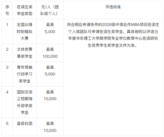 为奖励报考华东理工大学与澳大利亚堪培拉大学合作举办工商管理硕士学位教育项目(以下简称“中澳合作MBA项目”)的优秀学生,倡导“勤奋求实,励志明德”的学风和校风,鼓励学生勤奋学习,华东理工大学商学院针对2026级中澳合作MBA的优秀学生设立奖学金,具体实施办法如下: