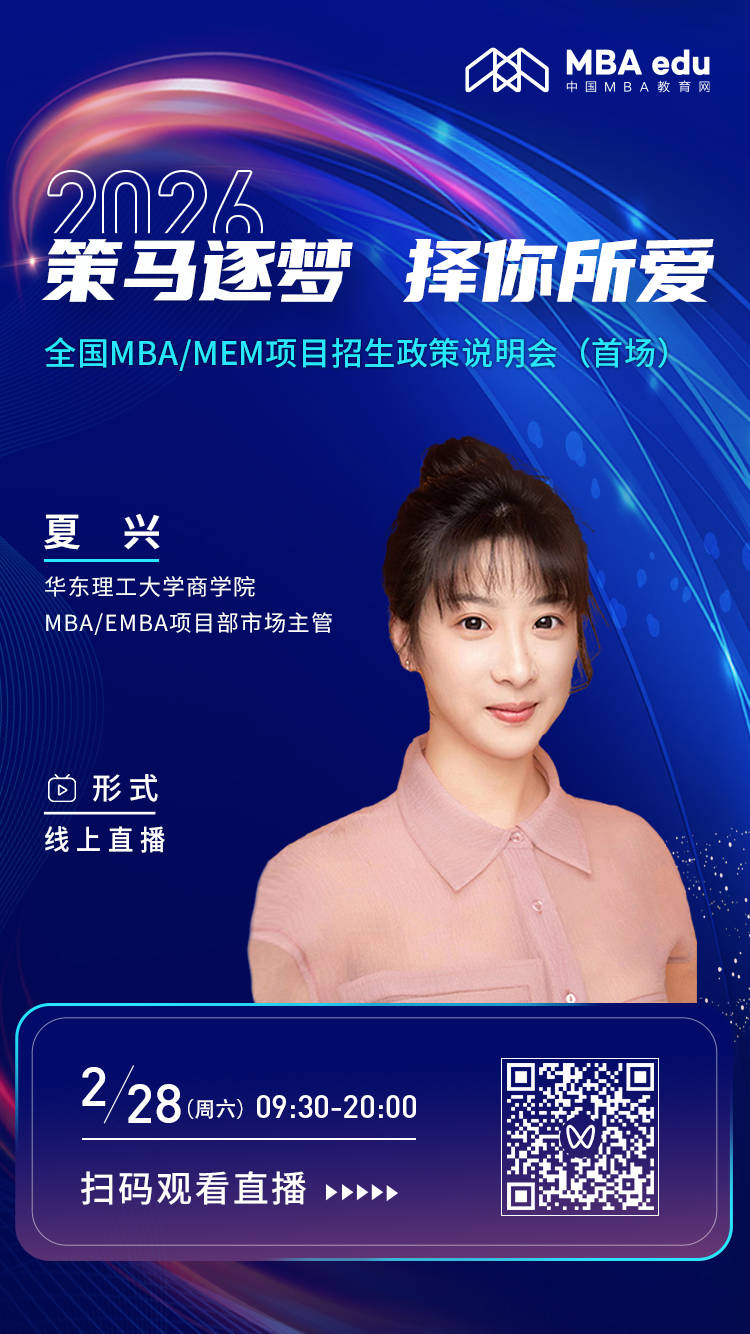 为助力广大考生获取一手资讯,把握2026年入学机遇,2月28日(周六)9:30,由中国MBA教育网主办的“策马逐梦 择你所爱——2026全国MBA/MEM项目招生政策说明会(首场)” 即将盛大开启。本次说明会特邀全国30多所知名MBA/MEM培养院校的主管院长、项目主任、招生主管莅临直播间,就考生关心的热点问题进行深入交流与解答。