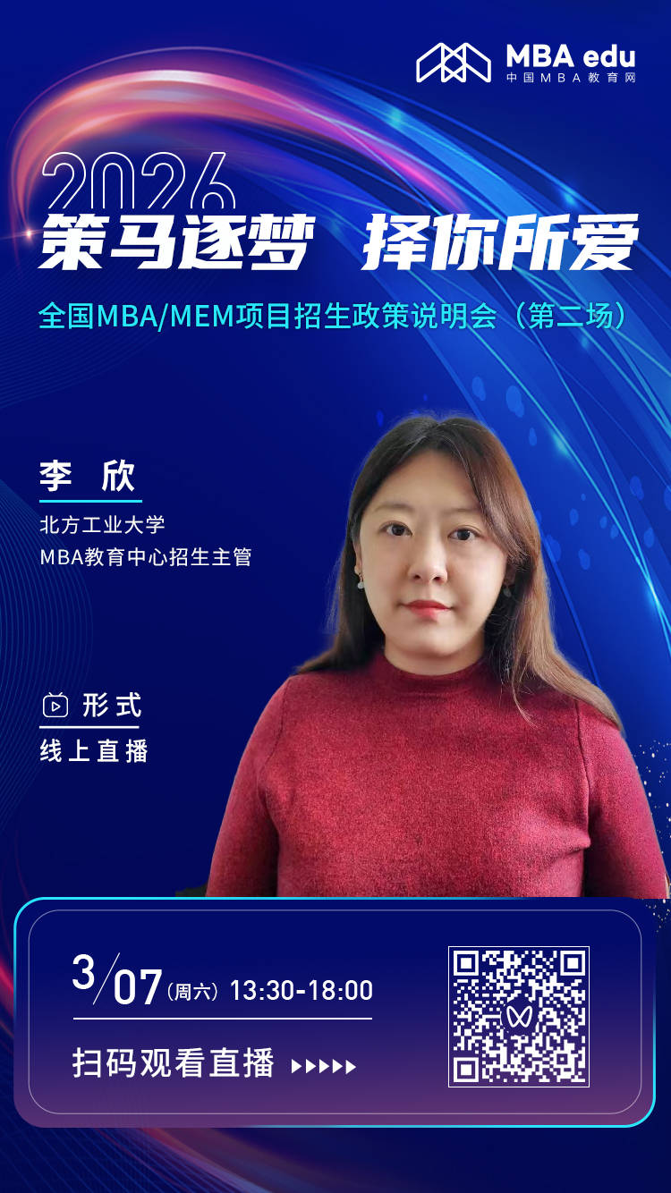 届时,北方工业大学MBA教育中心招生主管李欣老师将亲临线上直播间,深度剖析北方工业大学MBA的独特魅力、报考策略、复试攻略等核心资讯,并及时回应考生疑问。时不我待,敬请广大考生踊跃参与,把握关键契机,共赴梦想的商学殿堂!