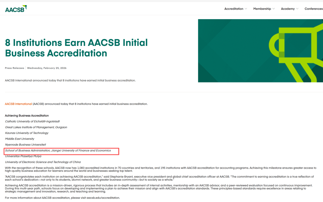 AACSB执行副总裁兼首席认证官StephanieM.Bryant评价道,AACSB认证旨在表彰那些在教学、科研、课程建设及学生学习成果等方面持续追求卓越的院校,江西财经大学工商管理学院在认证过程中展现出的坚定投入与系统改进,充分体现了学校、学院对学生培养质量、校友发展与社会责任的高度重视,彰显了其打造一流商科教育的决心与实力。